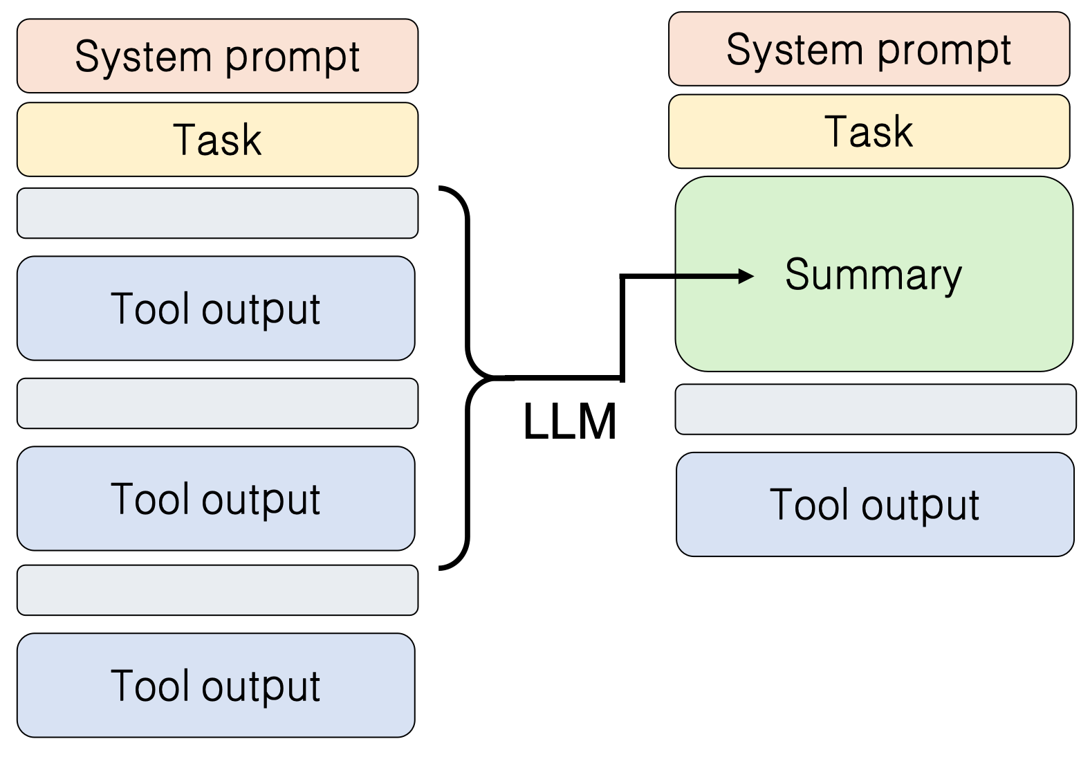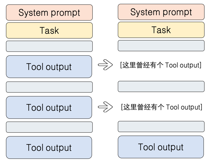 - 替换(结果替换):另一个出乎意料的方法是,针对工具返回的冗长结果(如万行日志),直接将其替换为一个占位符:”这里曾经有个 Tool output“。神奇的是,实验表明这种方式居然能有效维持 LLM 的逻辑连贯性。