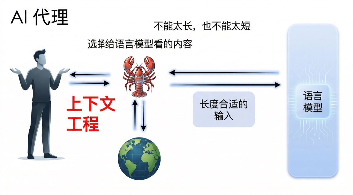 为了让大语言模型能够处理长程任务而不”断片”或”迷失”,上下文工程(Context Engineering) 成为了不可或缺的技术底层。它是一套由开发者设计的系统性机制,用于管理传递给 LLM 的信息流。在此系统中,AI Agent 扮演着大语言模型的”经纪人”或”守门员”的角色,通过各种预设规则或自主决策,确保传递给”大脑”(LLM)的每一条信息都是精确且高效的。