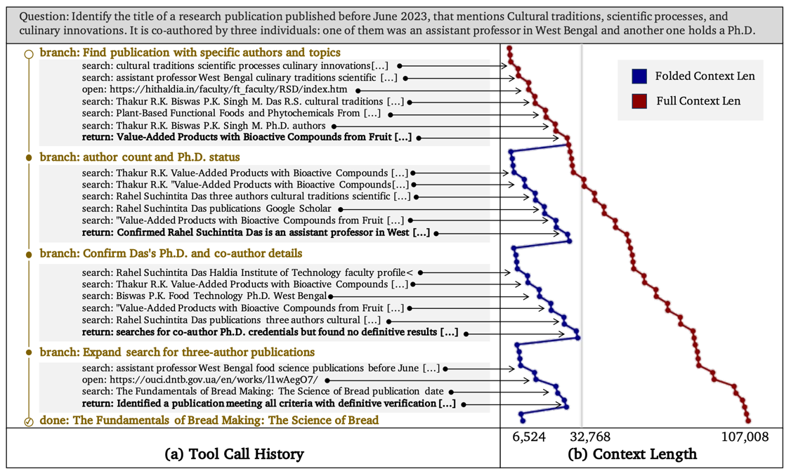 - 蓝线(Folded Context):主 Agent 每开启一个 Sub-agent(图中左侧的 branch),Token 开始累积(上升);一旦子任务结束并返回结果,中间冗长的搜索记录被瞬间抹除,Context 长度瞬间回落(下降)。