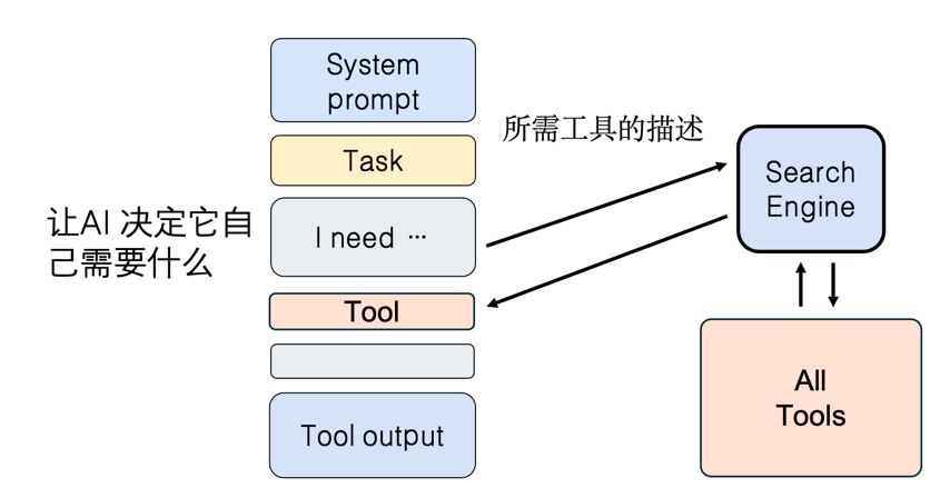 当 Agent 集成了大量工具时,如果每次调用都把全部工具的详细描述塞入 system prompt,上下文很容易被不必要的工具定义撑爆。更合理的做法是:让 AI 自主判断当前任务需要哪些工具,只将真正相关的工具描述动态挂载到上下文中,无关工具则保持在外部、不占用宝贵的上下文空间。