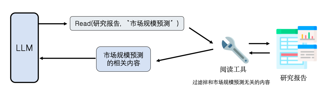 更聪明的做法是,让模型在发出读取指令时就带上筛选意图,例如:”我要读这份报告中关于市场规模预测的部分”。而 read 工具本身也不应只是”打开文件”,它还需要具备一定的智能,能够根据指令从海量内容中找出真正相关的段落。这背后的实现可以是一个小型语言模型——它接收读取指令,从原始资料中筛选出匹配内容,再传给主 Agent。主 Agent 因此只需聚焦于经过过滤的精华信息。