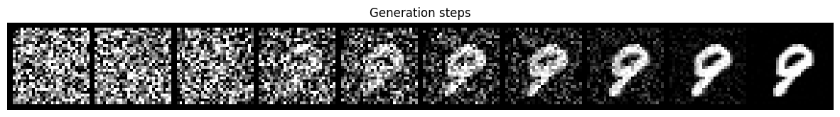 可以看到,初始画面完全由随机噪声构成。随着采样步数从 1000 走向 1,数字的骨架逐渐浮现。这并非简单的图像叠加,而是模型在数学空间中,一步步将数据分布从”无序”推向”有序”的必然结果。